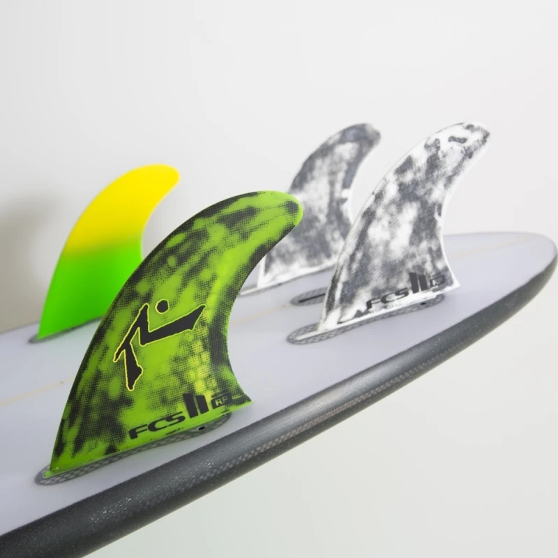 Rusty’s fin has a long base which creates an abundance of drive and acceleration. It sits relatively deep in the water, and has a long leading edge with an extended medium-to-large size tip. It’s interesting to note the tip has a thicker foil than most other fins, is therefore quite stiff, and will feel very receptive to the rider. So, when you push against the fins, the fins will react immediately with forward speed. The trailing edge has significant curve, and the sweep is not too high, meaning tail release is still achievable for surfers with enough power. The inside foil (IFT) on Rusty’s fin creates bite so you’ll feel really connected to the wave face during a more committed, drawn-out turn. This template has been a favourite with Rusty’s team for many years because it’s a trustworthy fin in bigger, more critical waves. It delivers a feeling of control, and a positive connection to the wave that allows you to confidently drive hard off the bottom, and lay into a big turn without fear of sliding out. The quad set also delivers a feeling of control, but with a little more freedom off the tail. While still considered to be performance orientated, Rusty’s fin is perfectly suited to higher volume hybrid models.